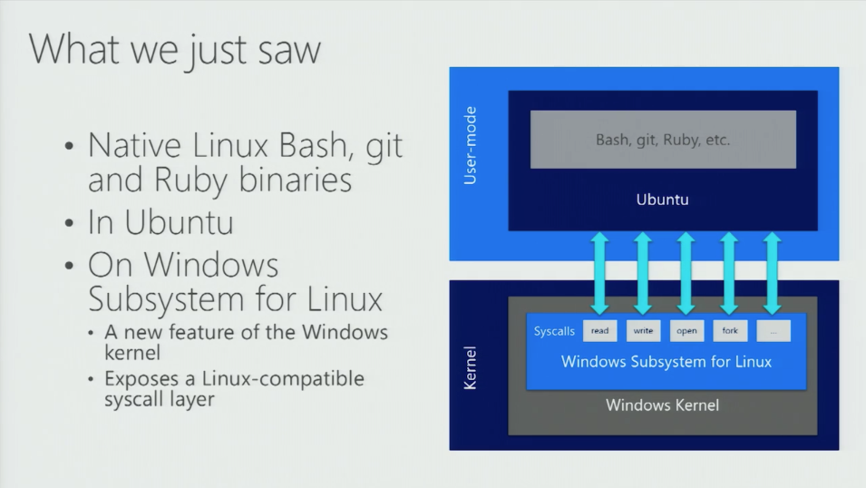其实在云计算领域,微软很早之前就让其 Azure 支持多个流行的 Linux 发行版,但对于普通消费者而言,真正的变化发生在后面的 Windows 10:微软宣布将会在 Windows 10 内置 Linux,而采用的技术上并非是所谓的「虚拟化」技术——也就是说,这个子系统的 Linux 完全是原生运行在 Windows 10 上的。