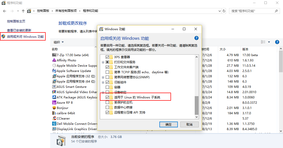 以上均确认后,打开 「控制面板」—> 「程序和功能」,在左边的「启用和关闭 Windows 功能」里面勾选「适用于 Linux 的 Windows 子系统」,然后点击确定(这一步有可能需要重启)。