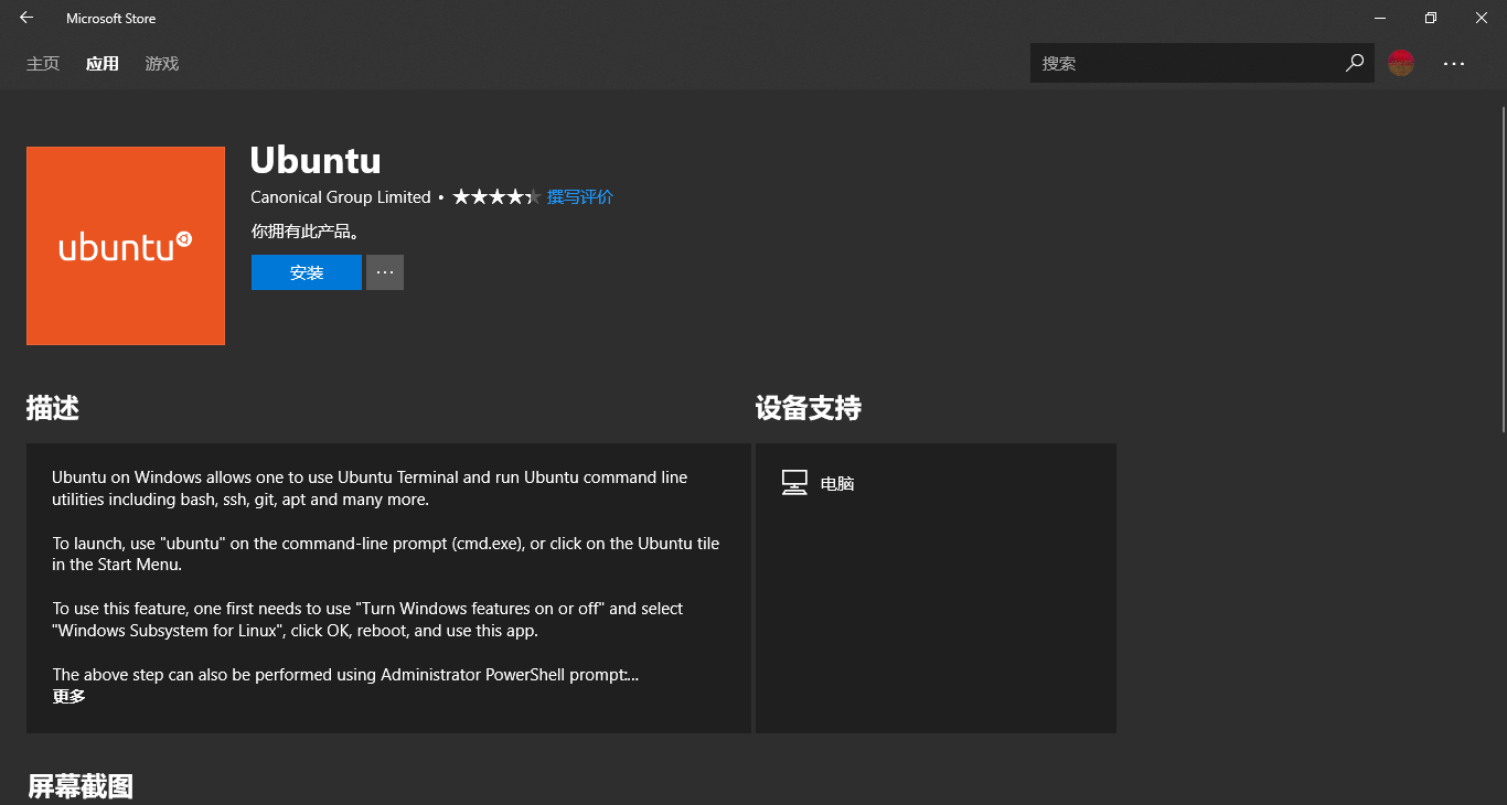 接着打开 Microsoft Store,搜索喜欢的 Linux 发行版,这里我选择的是我比较熟悉的 Linux 发行版 Ubuntu,然后点击安装。对于初学者来说,Ubuntu/ Debian 系的发行版具有非常完善的包管理系统,方便新手快速上手。