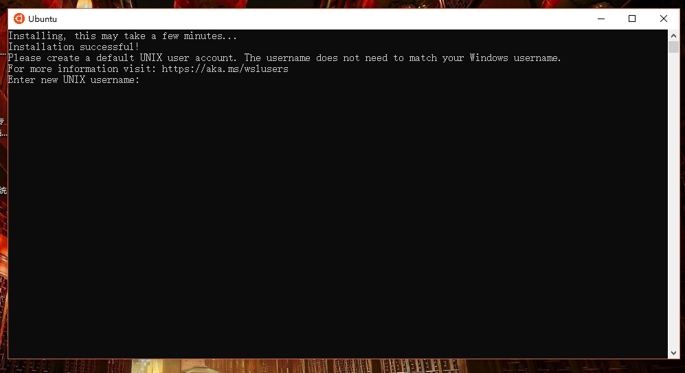 在开始菜单中打开 Ubuntu 后,Ubuntu 会进行较长时间的安装和初始化,之后会提示你设置 Linux 的用户名和密码,需要注意的是这个用户名和密码和 Windows 并不通用。