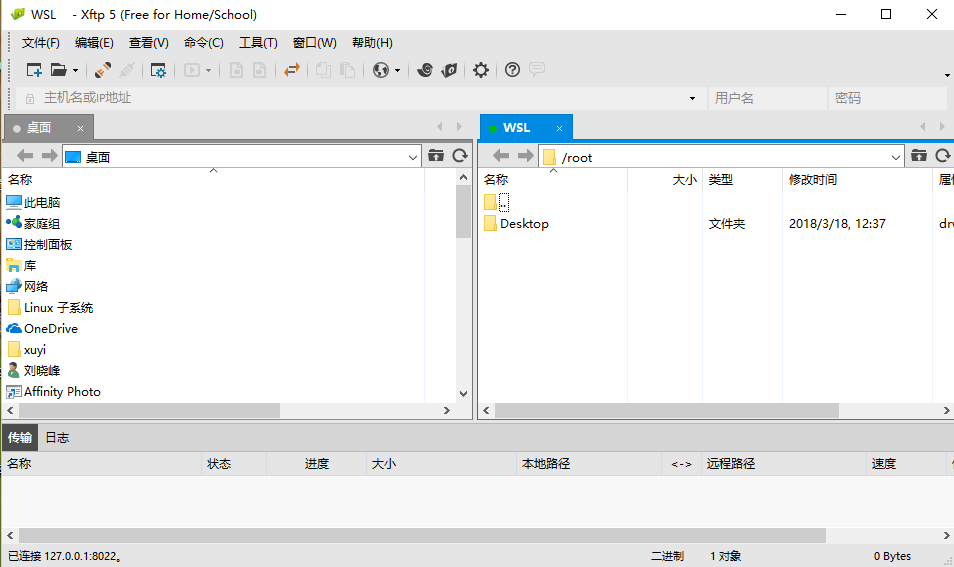 除了使用 Xshell 这种 SSH 客户端进行服务器操作之外,还可以使用 Xftp 进行文件上传和管理,唯一的区别是在新建会话处,协议选择「SFTP」,端口号和之前 Xshell 使用的端口号一致即可,点击确认之后出现类似 FTP 管理的界面就算是成功了!这样你就可以使用更为直观的工具来访问 WSL 系统的文件目录。新建文件上传文件也变得更为简单。