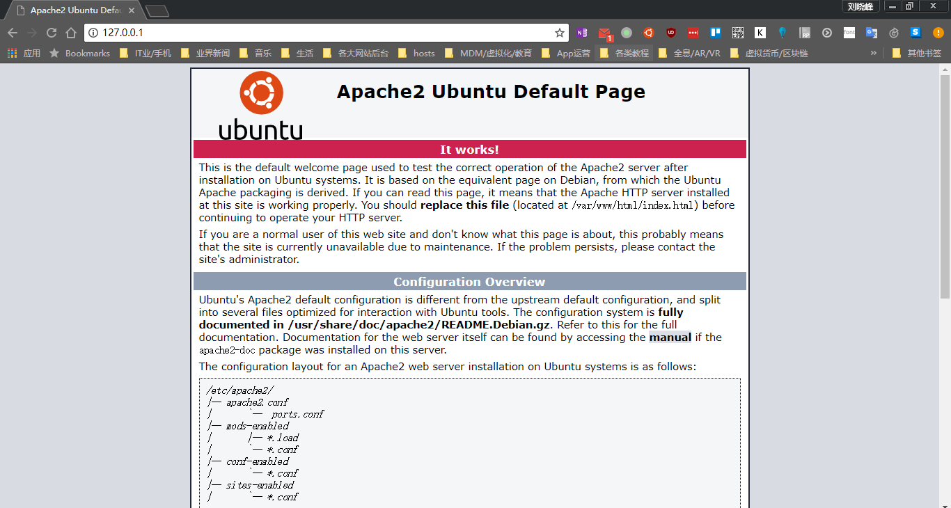 当终端里面显示诸如「 * Starting Apache httpd web server apache2」之后,打开本机的网页浏览器,访问:http://127.0.0.1 ,当显示以下页面就表示 Apache 网页服务器已经生效!