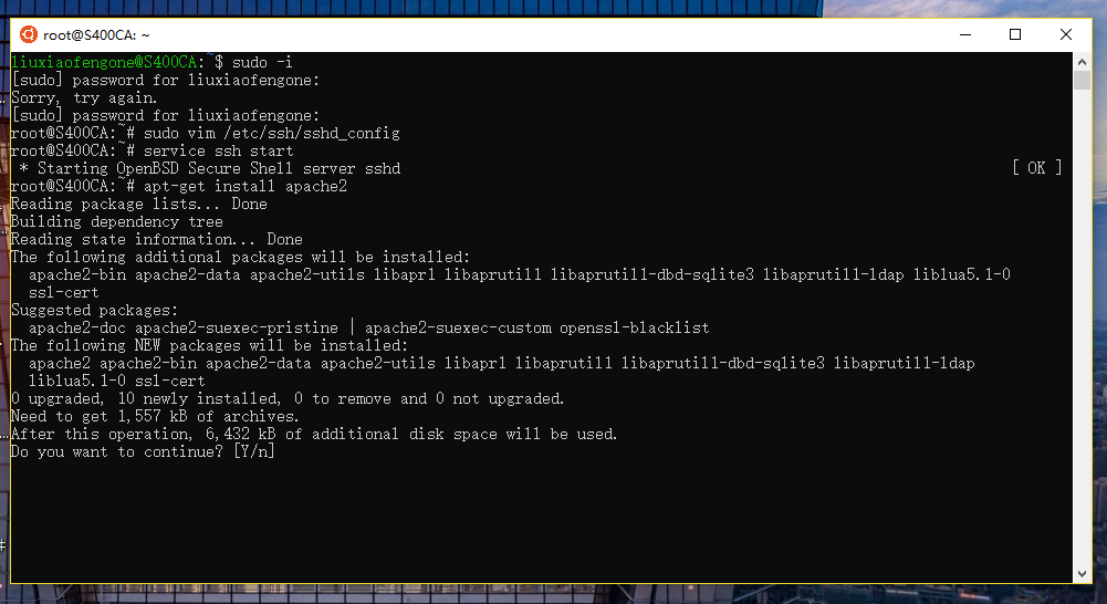 首先,我们要确保 WSL 中安装有 Apache 网页服务器,所以尝试安装(使用超级用户权限),在终端中输入:
