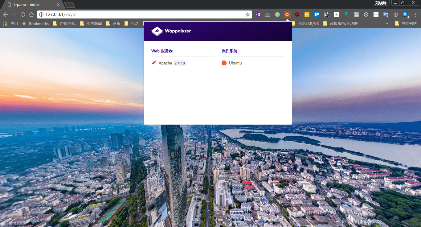 例如我现在传过去的网页全景项目名为「xuyi」,那么传好后我打开浏览器,访问:http://127.0.0.1/xuyi 就可以看到做好的网页的效果啦!如果你是使用 chrome 访问的话,Wappalyzer 扩展还可以显示出当前网站项目使用的框架等。