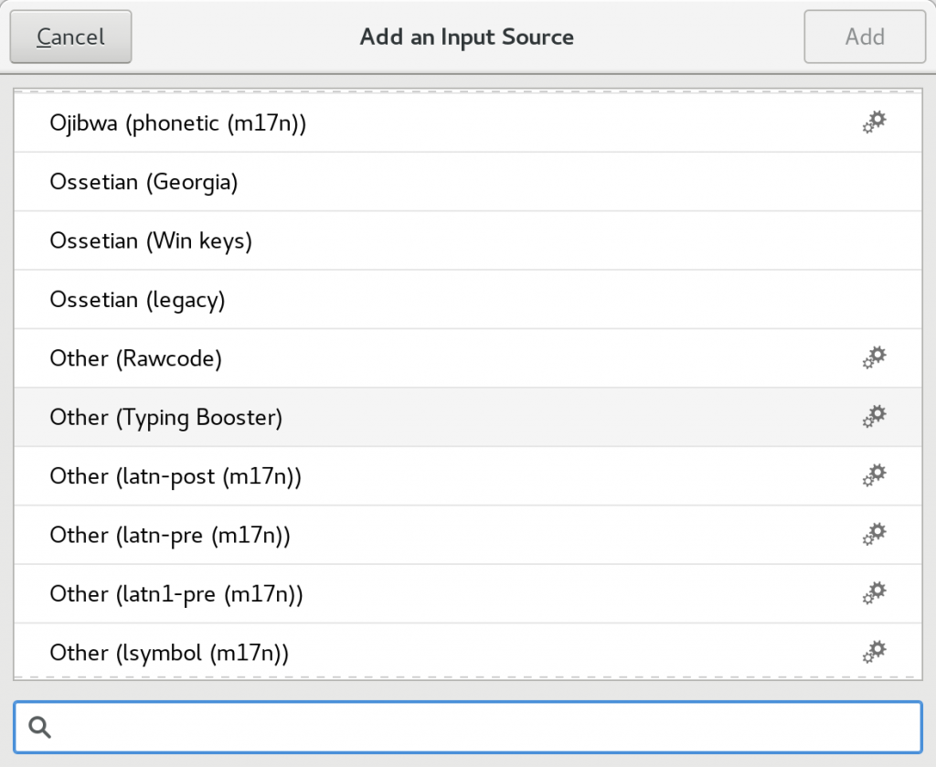 这个高级输入法由 iBus 在背后支持。该高级输入法可通过列表右侧的齿轮图标在列表中识别。