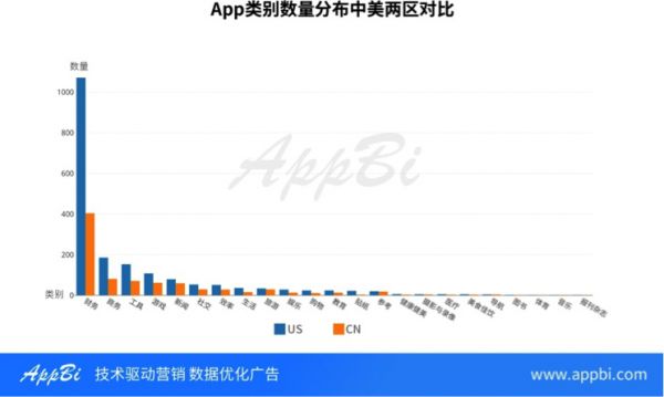 中美两国应用市场上和区块链相关的App共2993款,从App Store类别分类来看,主要包括财务、商务和工具类。以下是它们的数量分布,无论是美国还是中国,App数量呈现财务类>商务类>工具类。