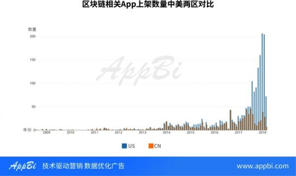 中美两国应用市场上和区块链相关的App共2993款,其中中国930款(31%),美国2063款(69%)。我们统计了每个月这些App的上架数量,2017年7月之前(含7月),中美两国的这类App上架数量大致相等。
