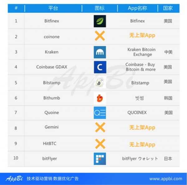 至于虚拟数字货币交易所和C2C交易平台(又称场外交易平台,OTC交易平台,由用户与用户之间发起交易,可使用法币购买虚拟货币,由第三方交易平台提供担保)方面,我们参考cryptocoincharts提供的排行榜,统计到只有部分交易所和C2C交易平台,拥有iOS App。