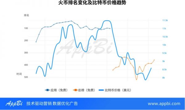我们结合App的榜单排名变化和比特币价格趋势进行比较,我们发现,综合而言,两者的变化趋势有很多时段是基本相似的,可见,比特币的价格也会对App的榜单排名产品一定程度的影响。