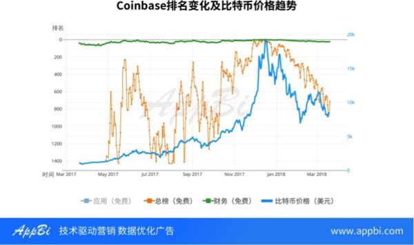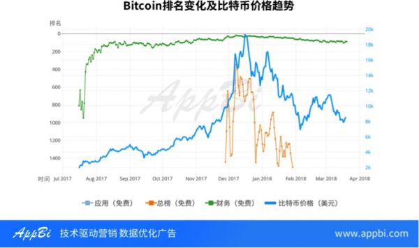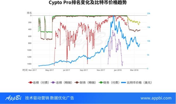 投放最多的App是《Crypto Pro: Bitcoin Ticker》。这款应用评分达到了4.5,比较受欢迎。它融合了虚拟货币的行情信息和新闻,图表比较精美。值得注意的是,这款App,上次更新时间是2015-04-24,目前它在中国区应用市场已经下架。在2018年2月4日,这款应用由付费应用改为免费应用。榜单变化及比特币变化趋势如下:
