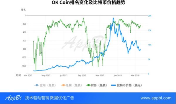 用户使用《OK Coin》可以实时了解比特币、莱特币、以太坊(ETH)价格波动。它在财务类别中的排名在2017年8月后明显下降,随后又慢慢呈上升趋势。
