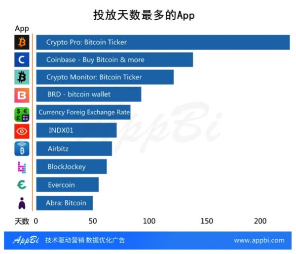 我们发现被投放广告最多App的关键词是“bitcoin”,累计有255款App投放了该词,有广告的天数占到了总监控天数的73%。