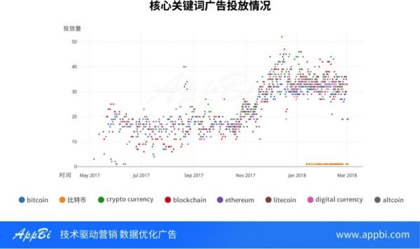 通过AppBi的App Store搜索广告监控系统,我们发现已经有部分广告主投身于区块链领域。我们重点监控了这个领域的一些核心关键词,以下是这些词的广告投放情况。
