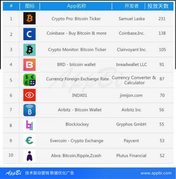 那么,这些相关区块链、比特币的广告是谁投放的呢?我们根据App投放广告的天数,列举了Top 10开发者,如下: