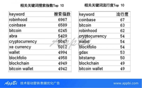 投放前三的广告主,其中两个是做虚拟数字货币行情服务,一个是做虚拟数字钱包。通过我们的AppBi Bot获取到了,这些应用正在投放的广告关键词,并配合苹果当前的流行度指数和搜索指数我们一起看一下:
