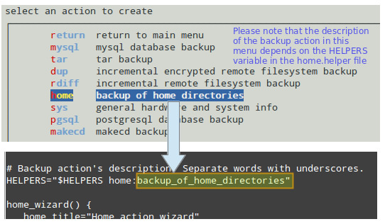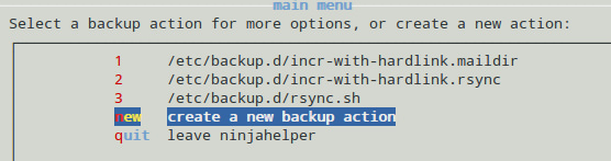 接下来我们将要创建helper文件(/usr/share/backupninja/home.helper)。这样,hendlers将会以菜单的形式在ninjahelper中显示: