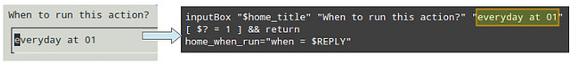 inputBox "$home_title" "When to run this action?" "everyday at 01"