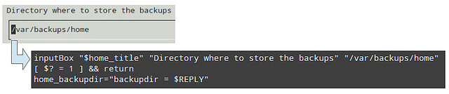 inputBox "$home_title" "Directory where to store the backups" "/var/backups/home"