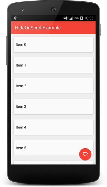 如果可以的话,我们希望当屏幕向下滚动时,App的Toolbar和FAB将离开屏幕,从而在垂直方向上为可显示区域腾出更大的空间来显示我们的内容。而当我们的屏幕向上滚动时,App的Toolbar和FAB会再次出现。