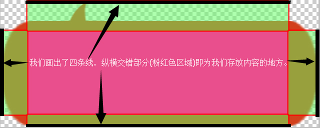 4.我们可以看到有四条线,就是我们上面所说到的构成九个区域的四条线,那么我们就可以直接通过拖拉着四条线选择我们所需要的区域即可,完成后在图片可以看到左和上有两条黑线,而把鼠标放到中间,就可以看到我们图片实际拉伸的区域。