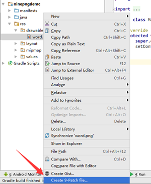 1.打开AS,将你要制作点九图的.png图片放到工程目录的drawable文件夹下(例如我准备了一张word.png),右键,选择 Create 9-Patch file