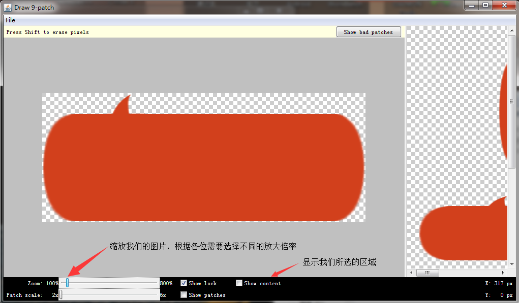 5.拉伸右边的预览框,可以看到我们的.9图在不同拉伸情况下的效果。