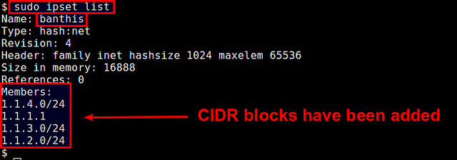 $ sudo ipset add banthis 1.1.1.1/32$ sudo ipset add banthis 1.1.2.0/24$ sudo ipset add banthis 1.1.3.0/24$ sudo ipset add banthis 1.1.4.10/24