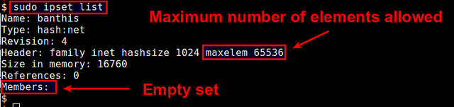 这显示了一个可用的IP集合列表,并有包含了集合成员的详细信息。默认上,每个IP集合可以包含65536个元素(这里是CIDR块)。你可以通过追加"maxelem N"选项来增加限制。