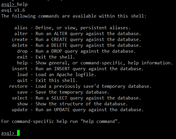一个名为 .asql 的隐藏文件,保存于用户的 home 目录下,记录用户在 asql shell 中输入的命令历史。因此你可以使用方向键浏览命令历史,按下 ENTER 来重复执行之前的命令。