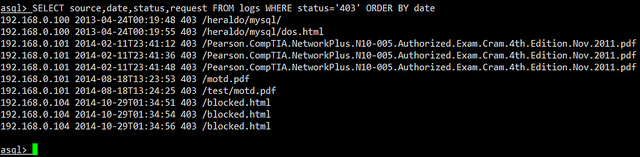 SELECT source, date, status, request FROM logs WHERE status='403' ORDER BY date