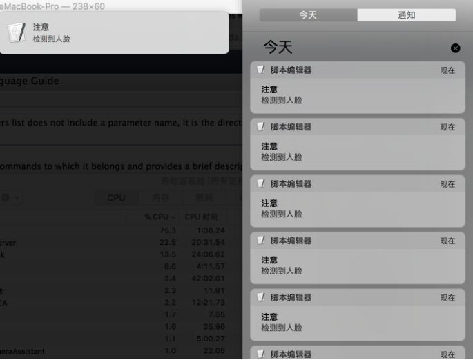 代码的原理很简单:通过opencv捕获摄像头获取的图像,然后交由dlib的face detector进行检测。如果检测到脸部,则通过AppleScript发出系统提醒(notify函数即通过process执行AppleScript发出提醒,如果你使用的是Windows,也可以替换成别的内容,例如Win下使用VBScript发出弹窗提醒)。