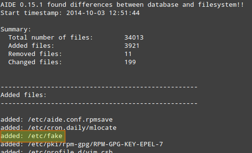 最后,让我们修改文件内容(如,添加一个注释行到/etc/aide.conf)。