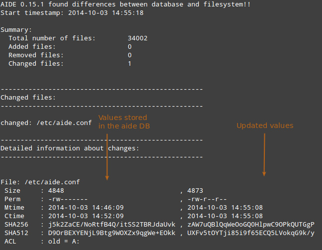 上面的截图中,第一栏显示了文件的属性,第二栏是AIDE数据库中的值,而第三栏是更新后的值。第三栏中空白部分表示该属性没有改动(如本例中的ACL)。