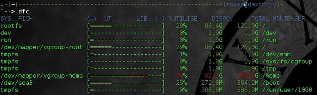 该命令可显示电脑上每一分卷的大小、 已使用空间、 可用空间、 已使用空间百分比和挂载点。 注意 我们必须使用 "-h" 选项使得所有数据以可读形式显示(使用 GiB 而不是 KiB)。 但你可以使用 dfc 来完全替代 df 它不需要任何额外的选项就可以得到 df 命令所显示的内容 并且会为每个设备绘制彩色的使用情况图, 因此可读性会更强。