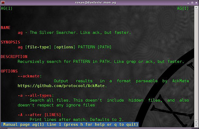 the silver searcher 这个名字听起来很不寻常银搜索... 它是一款设计用来替代 grep 和 ack 的工具。 The silver searcher 在文件中搜索你想要的部分 它比 ack 要快 而且能够忽略一些文件而不像 grep 那样。译者注 原文的意思貌似是 grep 无法忽略一些文件 但 grep 有类似选项 the silver searcher 还有一些其他的功能比如彩色输出 跟随软连接 使用正则表达式 甚至是忽略某些模式。