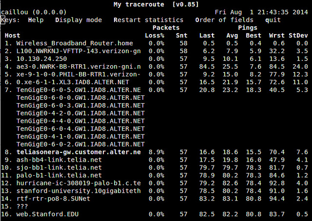 系统管理员的一个基本的网络诊断工具traceroute可以用于显示从本地网络到目标网络的网络第三层协议的路由。mtr即“My Traceroute”的缩写继承了强大的traceroute功能并集成了 ping 的功能。当发现了一个完整的路由时mtr会显示所有的中继节点的 ping 延迟的统计数据对网络延迟的定位非常有用。虽然也有其它的 traceroute的变体如tcptraceroute 或 traceroute-nanog但是我相信 mtr 是traceroute 工具里面最实用的一个增强工具。