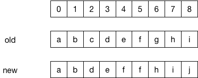 上图中,old dex中下标为2的item "c" 被DEL,c后面的元素前移,new dex中下标5处ADD一个item "f",而在下标8处又ADD一个item "j"。