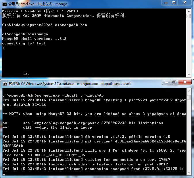c:\mongodb\bin>mongo 如果出现图,说明默认的test数据库连接成功。同时,在后台的cmd中也可以看到前台连接信息。