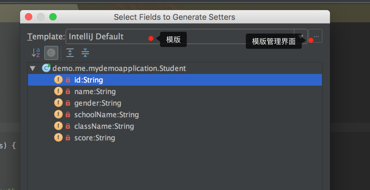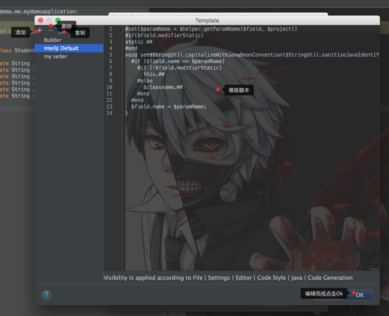 Template里就是setter的模版生成脚本,我们当前使用的是默认的。这个时候如果你回去上面的动图,会发现,我的这里是my setter。其实就是我自己写的一个生成脚本。但是后来我发现,根本没有这种必要因为,IntelliJ IDEA已经给我们准备好了。