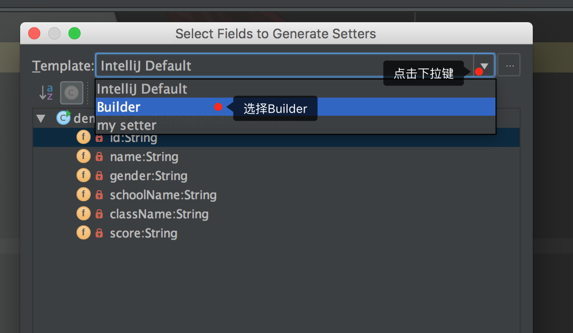 点击下拉键,选择Builder模版(这个模版就是带有this返回值的setter生成模版),然后再选择成员,确定,即可生成我们要的setter。