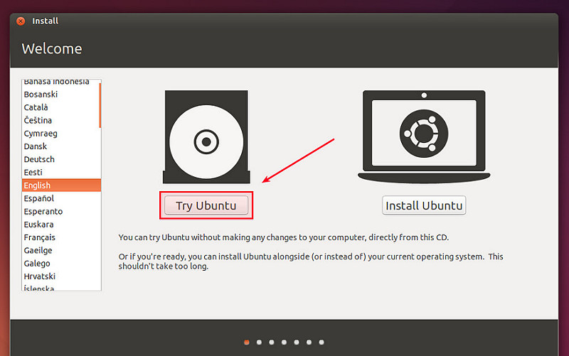 从 CD/DVD 或 USB 启动 Ubuntu 桌面后,点击第一个欢迎屏幕上的"Try Ubuntu"。