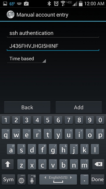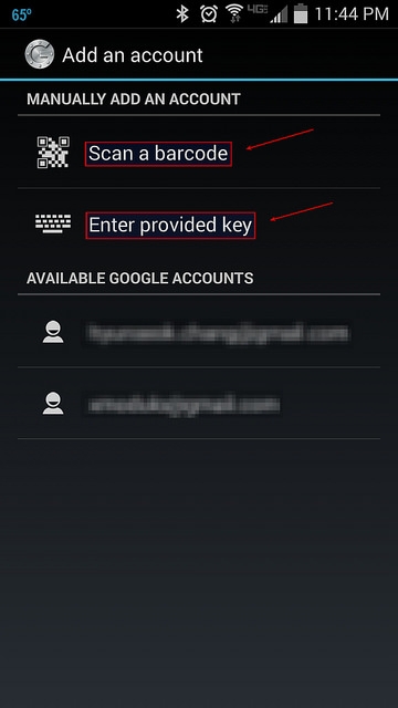 你可以选择“Scan a barcode” 或者“Enter provided key”选项。“Scan a barcode”允许你扫描二维码来完成密钥的输入,在此可能需要先安装扫描软件 Barcode Scanner 应用。如果选择“Enter provided key”选项,你可以使用键盘输入验证密钥,如下图所示: