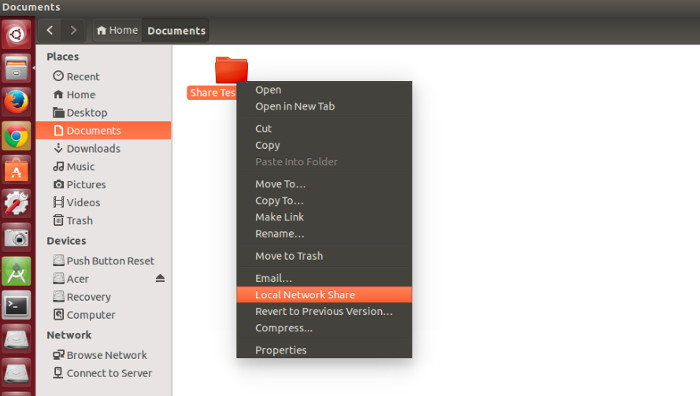 为了在Ubuntu上实现局域网共享文件夹,右键点击打算共享的文件夹,并选择“Local Network Share(本地网络共享)”: