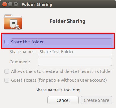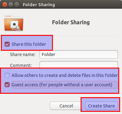 当选中“Share this folder”的选项,就会看到按钮“Create Share(创建共享)”变得可以点击了。你也可以“Allow others to create and delete fies in this folder(允许其他用户在共享文件夹中编辑文件)”。选项“Guest access(允许访客访问)”也是如此。