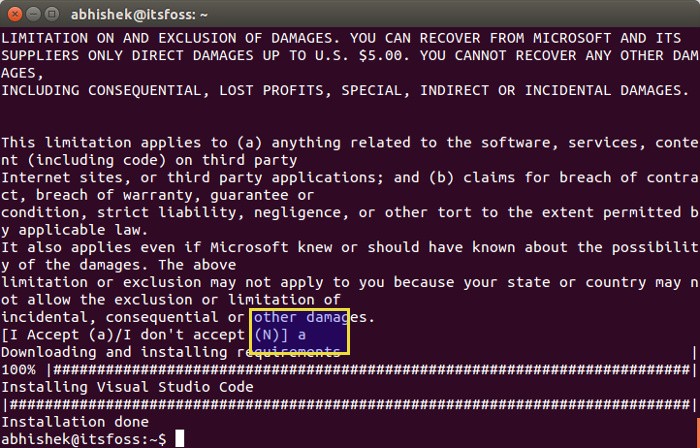 在抛出一堆要求和条件后,它会询问你是否确认安装Visual Studio Code。输入‘a’来确定: