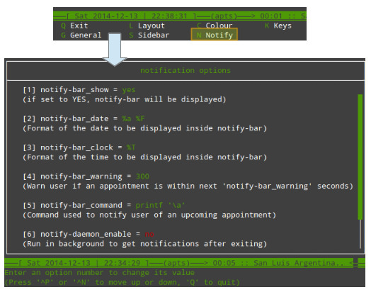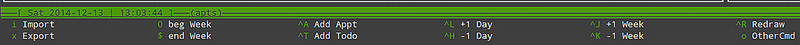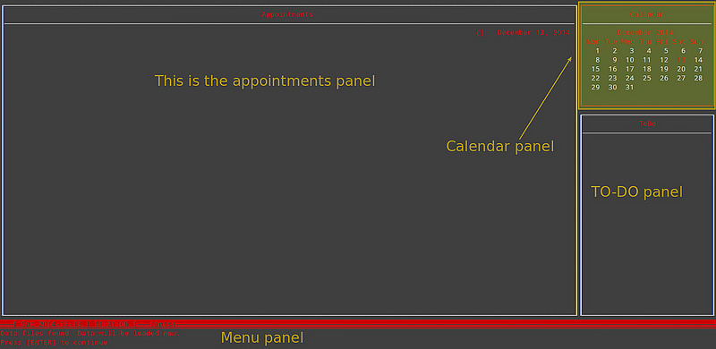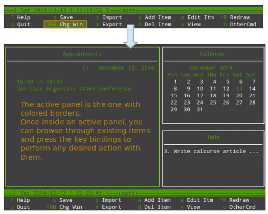 注意你可以使用你最喜欢的编辑器或者菜单底部的calcurse屏幕来编辑这些文件。你可以按下TAB来在不同的面板间切换,并选择你想要编辑的项目: