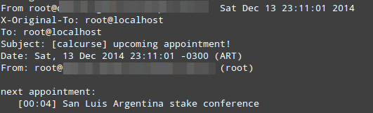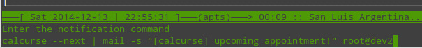 按照上面的设置之后,如果这个任务被标为重要,那么root@localhost会在300秒(或者5分钟)后收到邮件通知,这会发生在下一个安排的任务之前。如果你想要即使calcurse不在运行也启用这个功能,那么将notify-daemon_enable设成yes。在本例中,dev2是本机的主机名。
