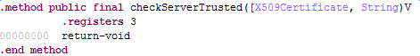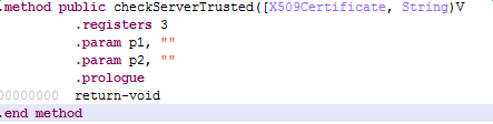 证书弱校验漏洞是在实现的 X509TrustManager 子类中 checkServerTrusted 函数没有校验服务器端证书的合法性导致的。360漏报4个,金刚漏报2个,AppRisk漏报3个。经过我的分析,一共有6处调用了checkServerTrusted,其中2处对证书进行了验证;而4处没有验证,直接返回,有两种形式,如下图所示: