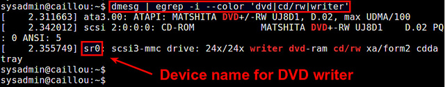 $ dmesg | egrep -i --color 'dvd|cd/rw|writer'