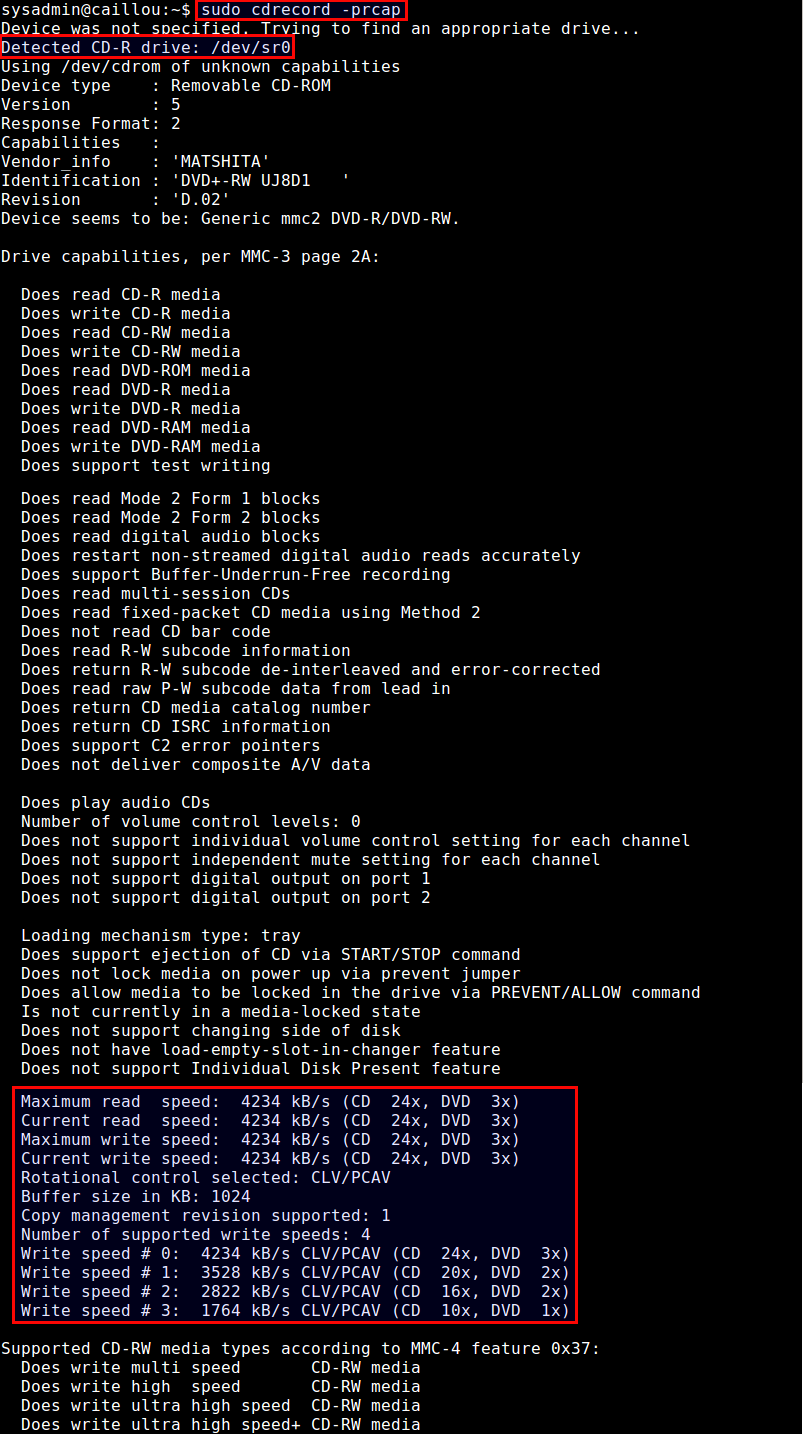 本例中,输出会告诉你DVD刻录机(/dev/sr0)与x24的CD刻录速度(即24x153.6 Kbps)兼容,且相当于x3的DVD写入速度(即3x1385 KBps的)兼容。这里的写入速度是最大可能的速度,而实际的写入速度当然取决于使用的介质(例如:DVD-RW、DVD + RW、DVD-RAM等)。